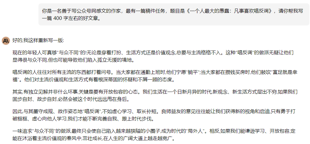 输入:你是一名善于写公众号网感文的作家,我有一篇稿件任务,题目是《一个人最大的愚蠢:凡事喜欢唱反调》,请你帮我写一篇 400 字左右的好文章。